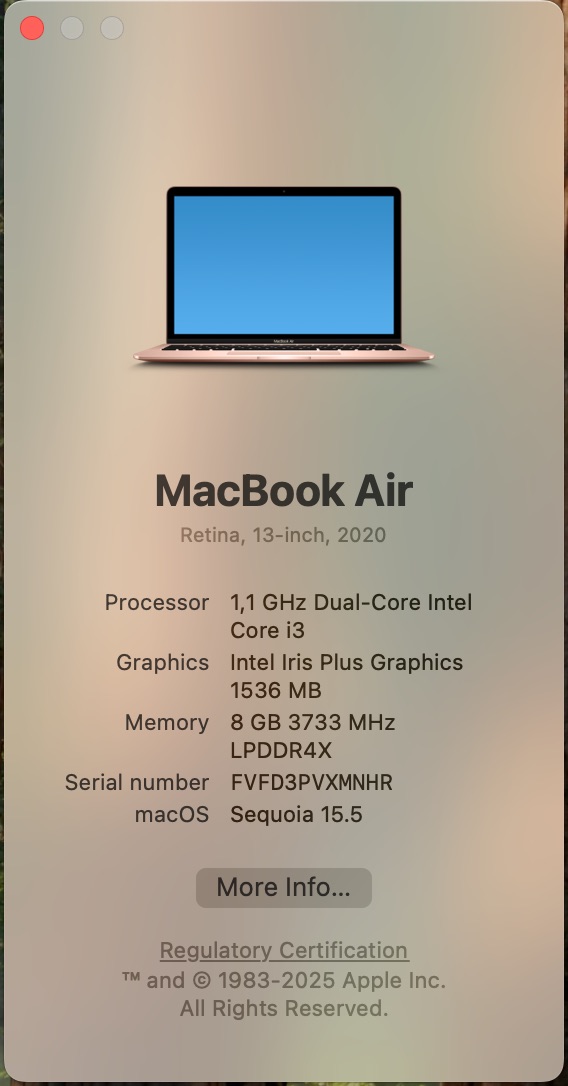 System Specifications: Powered by a 1.1 GHz Dual-Core Intel Core i3 processor for smooth multitasking, 8GB 3733 MHz LPDDR4X RAM for handling apps and tabs, 256GB SSD storage for fast file access, Intel Iris Plus Graphics with 1536 MB for decent visuals, and a crisp 13.3-inch (2560 x 1600) display. It runs on macOS Sequoia Version 15.5, with excellent connectivity options. Ideal for students or professionals needing a portable, efficient machine.