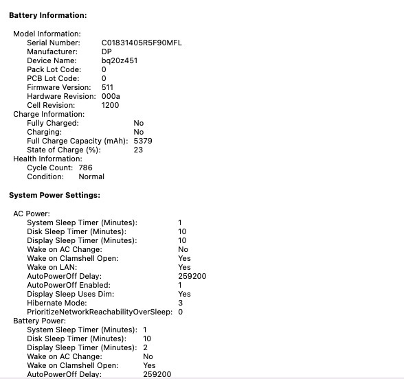 Battery: Based on the cycle count of 786, we’ve estimated the health at around 70-80%. It should handle moderate daily use, though you might want to keep it plugged in for longer sessions.